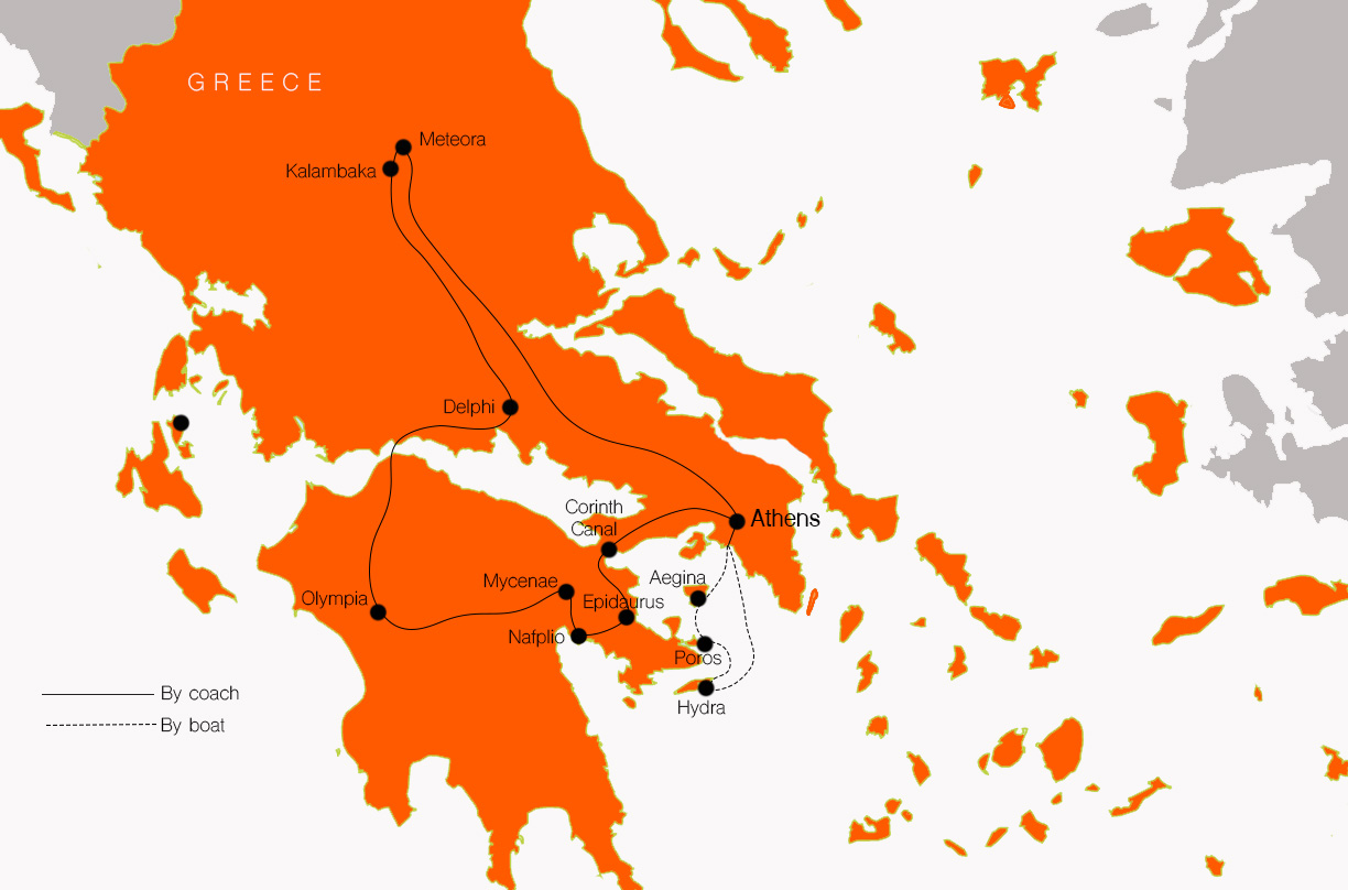 Visit the Corinth canal and Epidaurus for the best preserved ancient theatre. Pass by Beautiful Nafplio and visit Mycenae “Rich in gold” as Homer described. We visit the Olympia complex, home to the original olympic games and the Temple of Zeus. Continue to the UNESCO World Heritage site of Meteora, visiting stunning rock formations. Finihs your tour with a day trip island hopping around the Saronic gulf, visit ‘vehicle free’ Hydra, hike to the clock tower on Poros and buy delicious local pistachios o Aegina. Back to Athens to relax for another night before transferring either to the airport for your onwards journey, or to the port of Piraeus for your Mediterranean cruise.